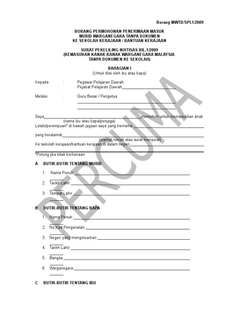 Borang Pendaftaran Murid Warganegara Tanpa Dokomen Pdf